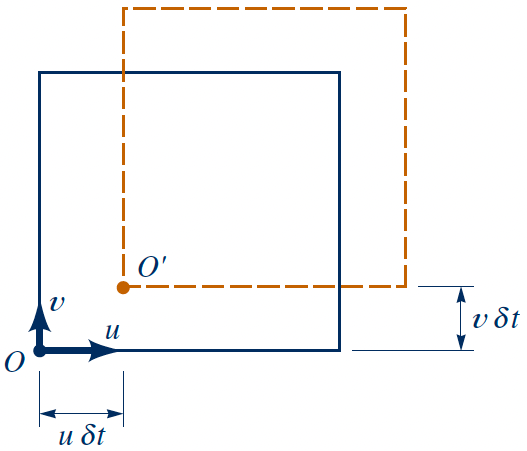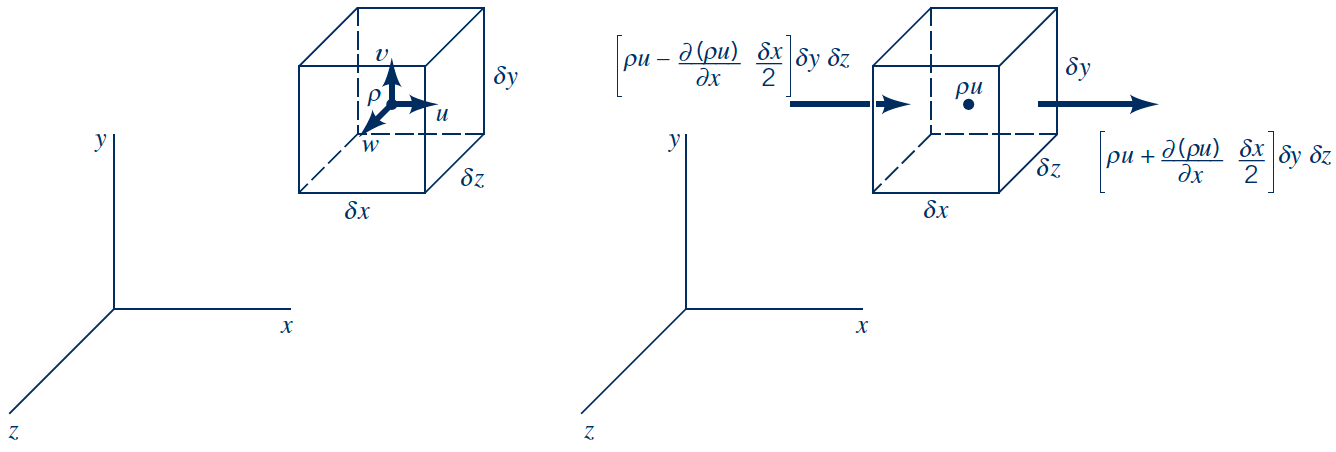 $$ \Downarrow $$ $$ \left( \frac{\partial \rho}{\partial t} + \nabla \cdot (\rho \boldsymbol{V}) \right) \delta x\, \delta y\, \delta z = 0 $$The compressible continuity equation: