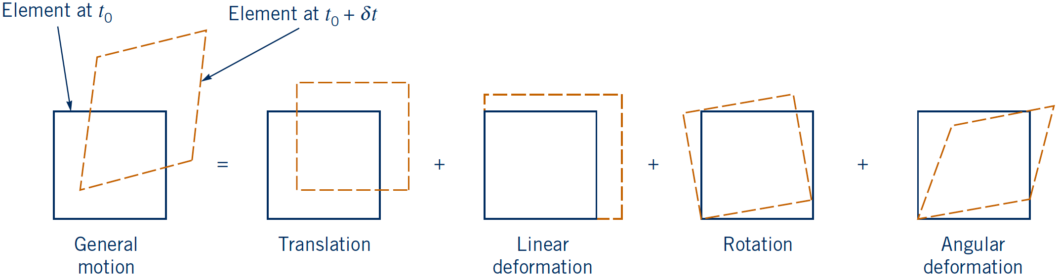 Key result: The general differential equations of fluid motion (Cauchy momentum equation): $$ \rho \ \boldsymbol{g} + ( \nabla \cdot \boldsymbol{\sigma} ) = \rho \left( \frac{\partial \boldsymbol{V}}{\partial t} + (\boldsymbol{V} \cdot \nabla) \boldsymbol{V} \right) $$